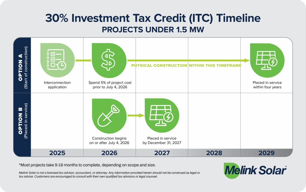 | Path 1 — Begin Construction by July 4, 2026 | Start physical work of a significant nature or meet the 5% Safe Harbor test* | Full 30% ITC (plus any applicable adders) and it must be placed in service within four years |
